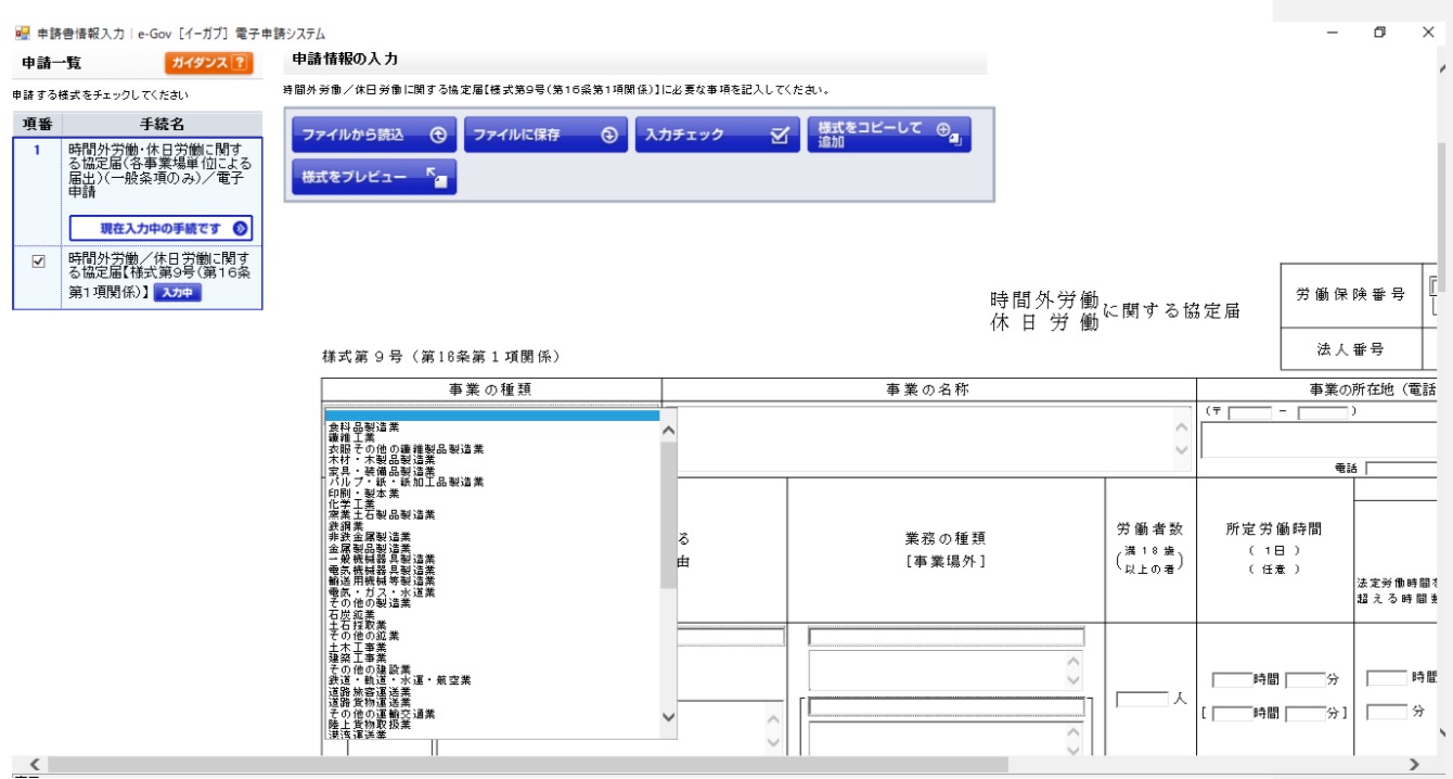 「事業の種類」「時間外労働をさせる必要のある具体的な理由」「業務の種類」「休日労働 をさせる必要のある具体的な理由」「所定休日」「労働させることができる法定休日の日数」 「協定の当事者の選出方法」については、プルダウンの中から選択することができます。