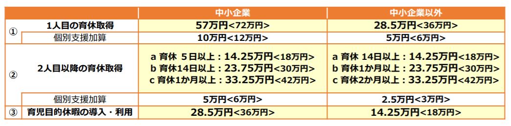 男性労働者の育児休業取得促進のために、管理職研修などの社内研修に取り組み、育児休業等を取得しやすい「職場風土作り」を事前に行った後に、実際に男性労働者に育児休業・育児目的休暇を取得させた事業主に助成金を支給。