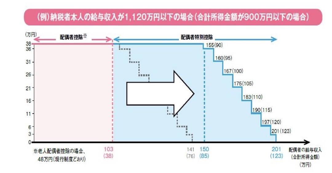 今回の改正では、収入が1,120万に満たない方にとっては、配偶者控除の枠が広がっておりますので、配偶者の収入が103万から150万に増えても所得税の増税にはなりません。