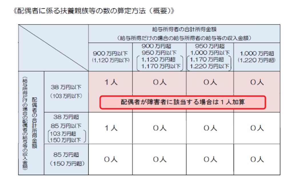 ・同一生計配偶者が障害者に該当する場合には、扶養人数を+1人で計算する。